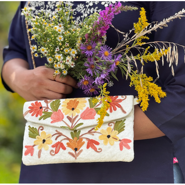 Hand-embroidered in Kashmir, each bag showcases intricate craftsmanship and reflects the rich cultural heritage of the region. With its unique, one-of-a-kind patterns, no two bags are exactly alike, ensuring you own a truly special piece. Visit us in-store or let us choose for you!