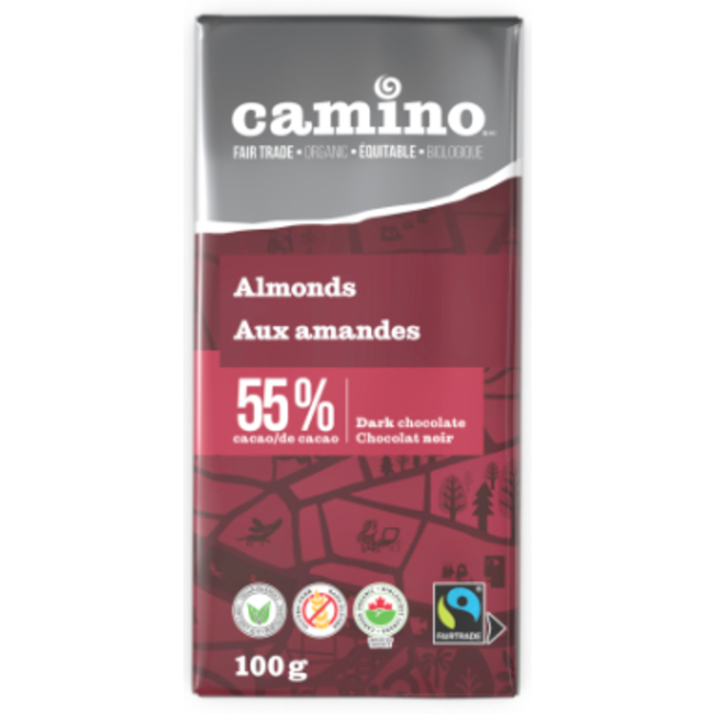 Ingredients: Cacao mass*, Sugars* (golden cane sugar*, whole cane sugar*), Cacao butter*, Crushed almonds, Ground vanilla beans*. Minimum 55% cacao. *Fairtrade certified.