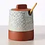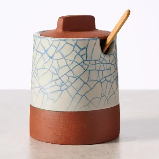Made from terracotta and featuring a unique blue crackle glaze, this adorable little crock will look great in any kitchen. The removable lid, complete with a handle and a slot for the included wooden spoon, makes dipping and drizzling simple and neat! Crackle will vary - each piece is unique!