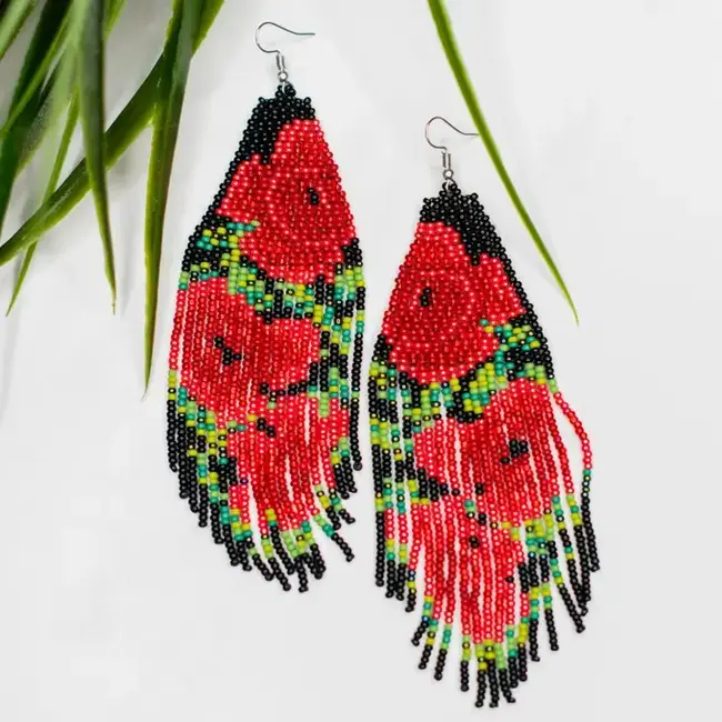 Earrings measure 6" long from nickel-free hook to bottom fringe and 1.5" W.
