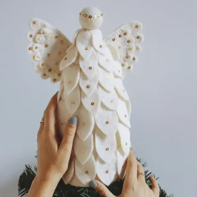 Featuring layered wings and tiered detailing on the heavenly body, this handmade angel is sure to enhance your tree with more spirit.