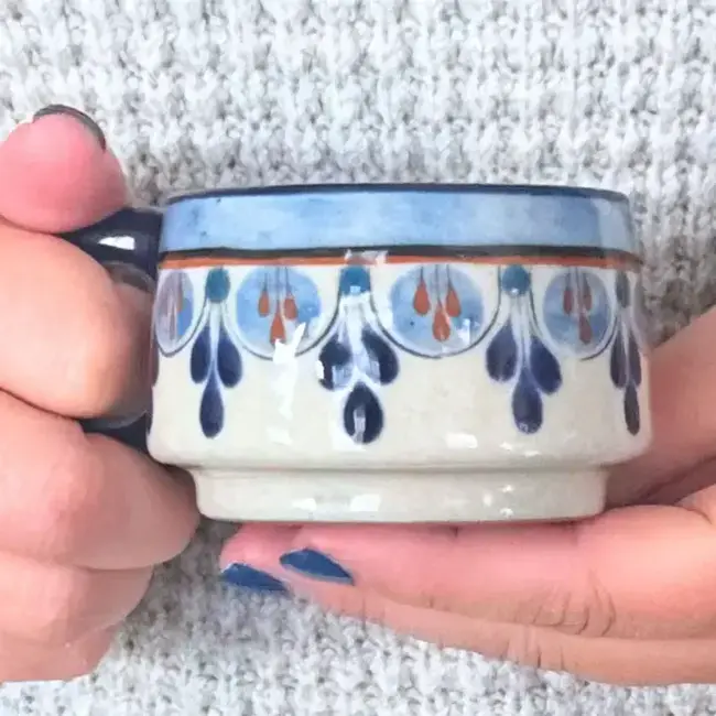 This handmade ceramic cortado cup is hand-painted with a timeless drip motif and finished with a rich colored rim—available in Blue or Green. The petite size is perfect for cortados, espresso, macchiatos, or a small tea, and the comfortable handle makes it easy to cradle while you sip.