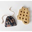 This playful game features a cute cat holding the game board, where you can use the included wooden pegs to play. The bag, made of assorted blockprint fabric scraps and jute string, can be tied onto the cat's tail to easily transport the small game pieces.