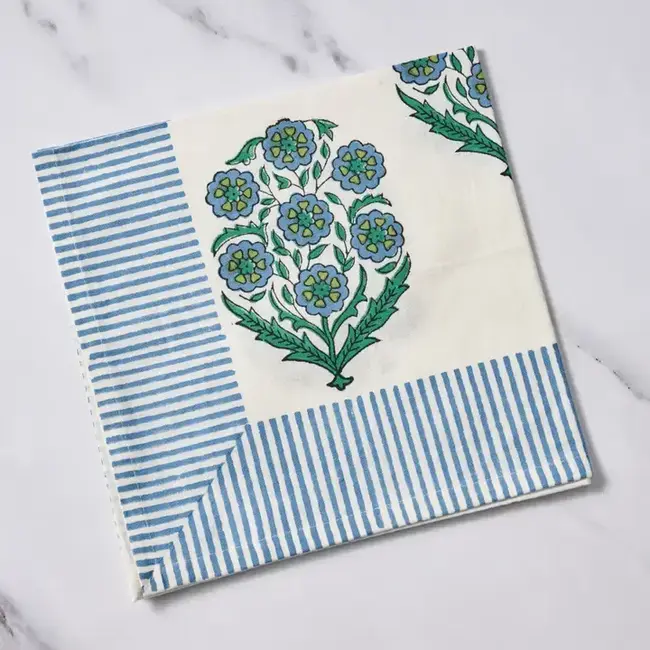 Hand block-printed on soft, 100% cotton, this gorgeous napkin features an ivory backdrop blooming with clusters of blue flowers and fresh green leaves, framed by classic blue striped edges. They are an easy way to layer handcrafted beauty into everyday meals and special gatherings alike. Includes one napkin. Coordinates with Devika Floral + Stripe Block Print Tablecloth.