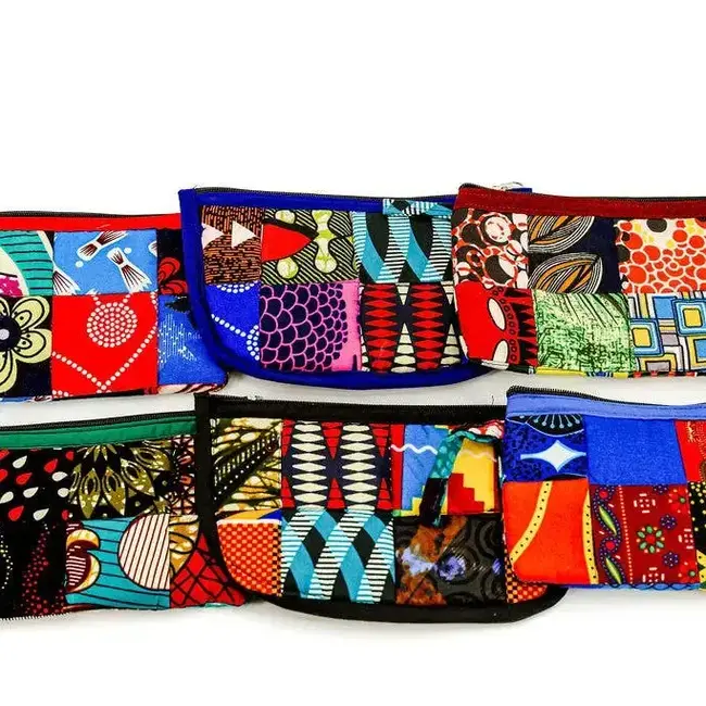 Each one-of-a-kind bag features a zippered closure and vibrant patchwork design, making it a stylish, eco-friendly choice for travel, makeup storage, or organizing small essentials.