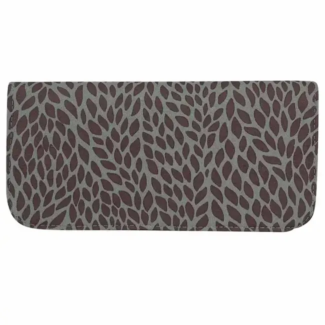 Cotton canvas with snap closure. Includes a pocket for dollar bills, two clear cover pockets for ID, a change pocket, and several spaces for your credit/debit cards.