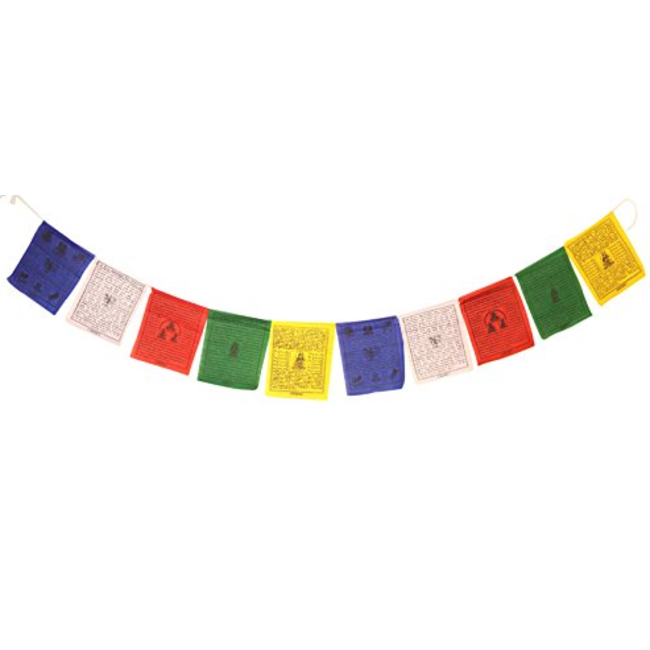 The flags contain separate prayers for knowledge, prosperity, peace, success and long life. Hung in places where they catch the wind they will scatter these prayers across the world to benefit all.Â