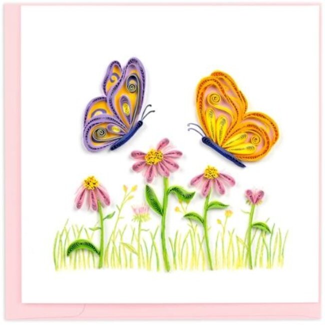 Delight the nature enthusiast in your circle with our Two Bright Butterflies Card, a vibrant ode to renewal and courage. With quilled precision, two butterflies in radiant purples and orange gracefully flutter above a meadow of pink flowers, creating a stunning visual symphony. Gift this card to evoke hope and bring a touch of the outdoors to someone's special day.