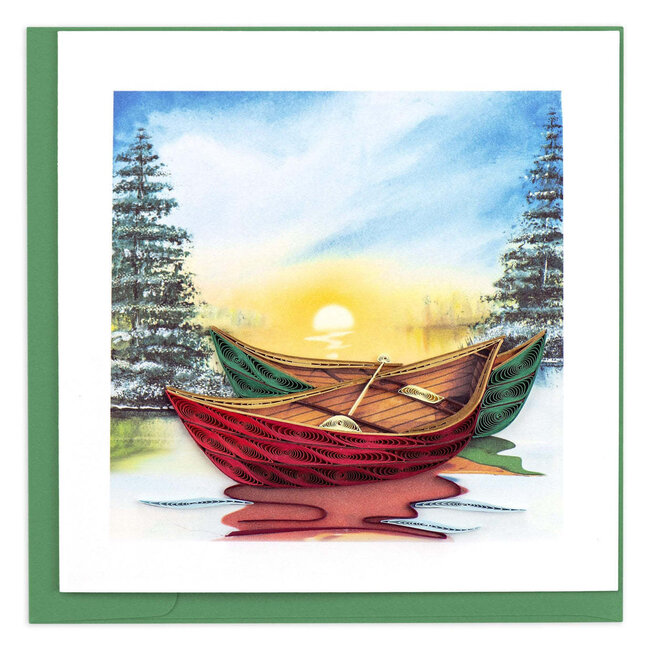 Send warm wishes with a quilled River Canoe greeting card during the cold winter months. The design features one quilled red and one quilled green canoe on a wintery watercolor river at sunset.