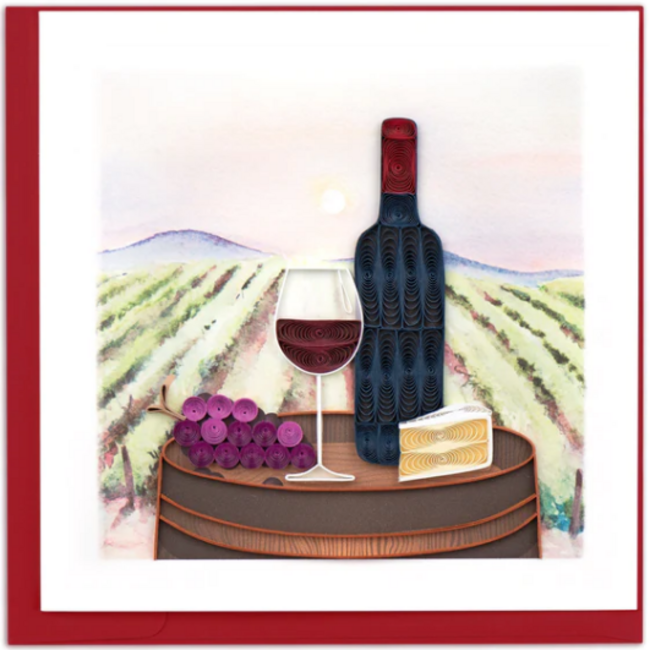 Invite a friend to a wine tasting at the vineyard with our quilled vineyard greeting card. This card perfectly captures the beauty of a vineyard in the summer. The card features a wine barrel in the foreground with a bottle of wine, filled glass, bunch of grapes and a slice of brie cheese on top of it. Behind the quilled elements is a beautiful, printed background of a vineyard landscape.