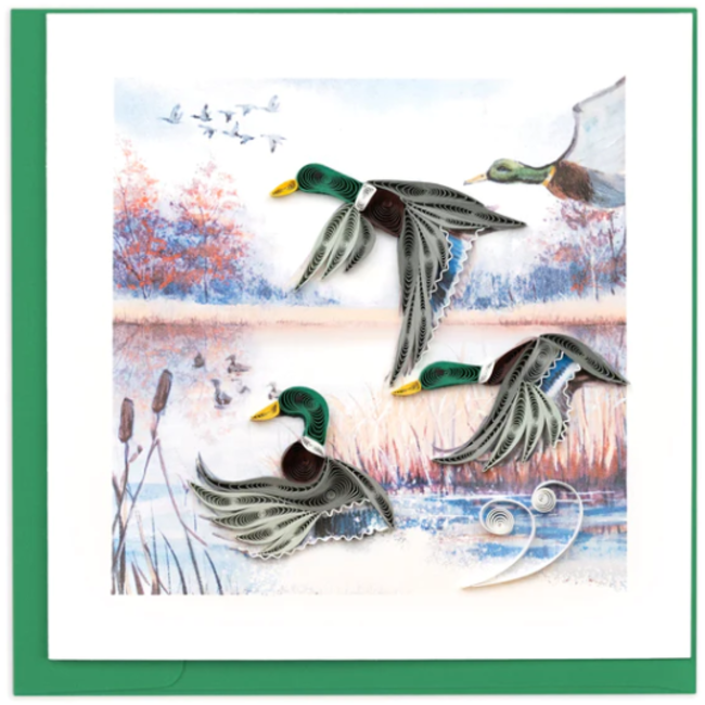Catch a peek as the Mallard ducks take flight on this beautiful water colored background.