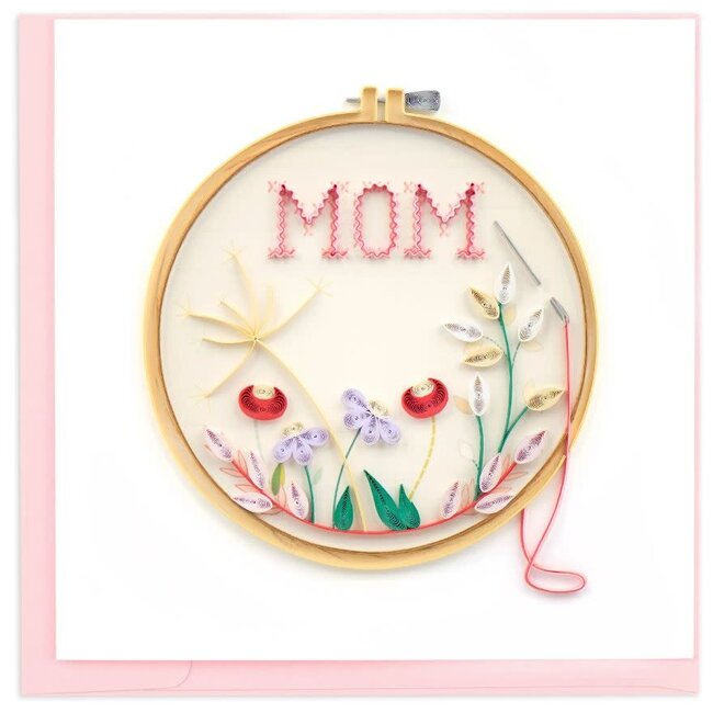 This design will have mom in stitches! The Quilled Mother’s Day Cross Stitch Card makes a thoughtful gift for any mom. This design features a hoop with a cross-stitched design of the words “MOM” and red, purple, pink, and yellow flowers.