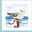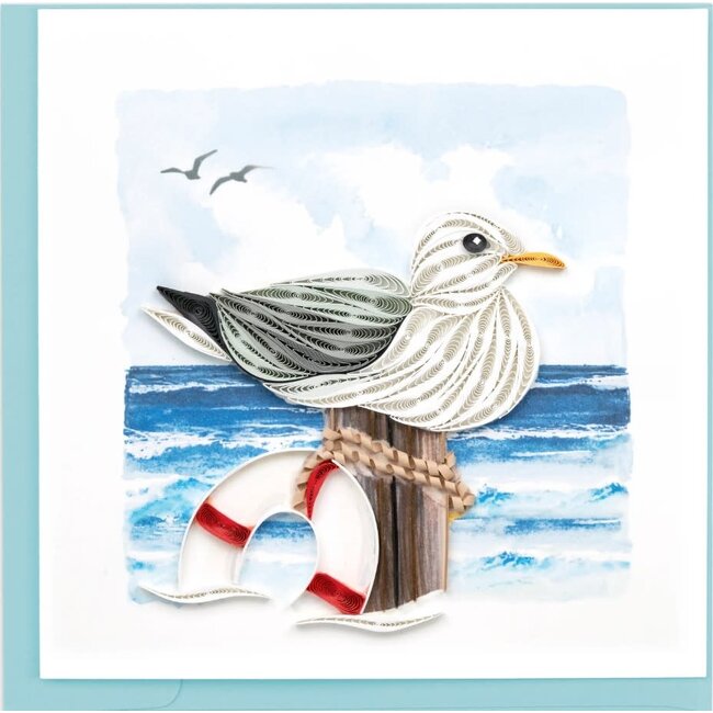 This card is as relaxing to look at as it is to give. A beautifully handcrafted quilled seagull sits peacefully atop a weathered wooden post and is gazing into the waves of the sea. You can see additional members of the flock gliding through the salty air in the background. A single red and white lifebuoy is affixed to the wooden post with burly rope and adds a pop of color to the card.