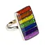 An adjustable cuff ring made of alpaca metal with a handcrafted resin banner sporting 7 colors of the rainbow with silver stripes between each.