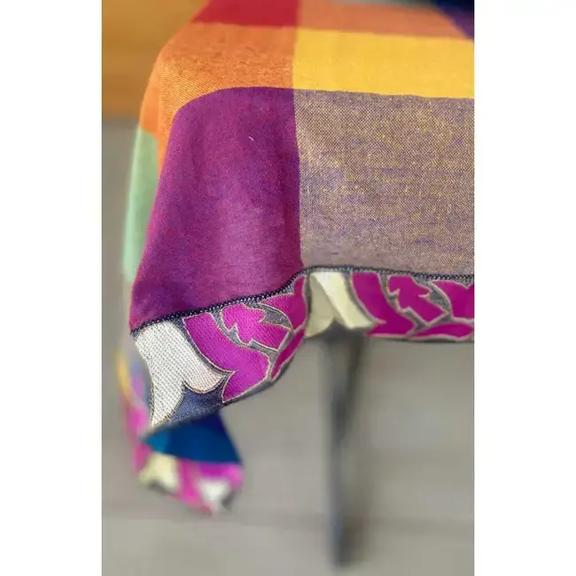 Colourful check pattern with upcycled sari trim.