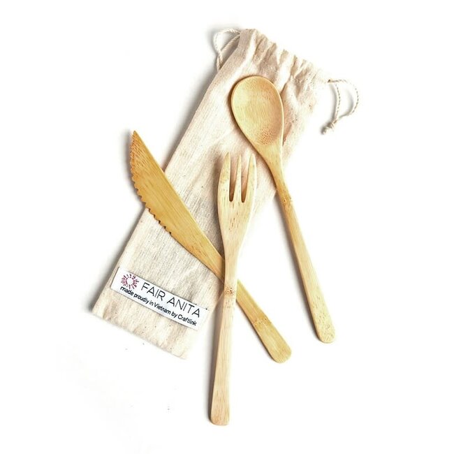 Reusable fork, knife, and spoon in a handwoven, organic cotton bag.